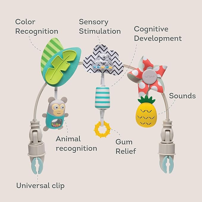 - Stimulating Instrumental Toys for Sensory Development Keep your baby entertained and engaged with this flexible stroller arch featuring 3 musical toys—maracas monkey, cymbal pineapple, and chime bell with teether. These fascinating sounds support sensory development, auditory stimulation, and fine motor skills from an early age.
