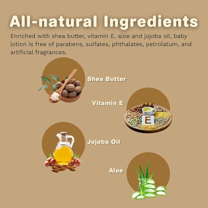- ALL-NATURAL INGREDIENTS: Enriched with shea butter, vitamin E, aloe and jojoba oil, baby lotion is free of parabens, sulfates, phthalates, petrolatum, and artificial fragrances; moms can trust our safe, plant-based blend certified natural by the NPA (Natural Products Association)