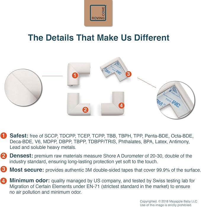 - CLEAN SAFETY: Roving Cove uses safe and pure raw material and was the first brand to make foam safety bumpers without the use of toxic flame-retardant chemicals (SCCPs). Our corner protector contains no BPA, no phthalates, no heavy metals, no latex, no SCCPs. Inherently flame-resistant; passed flammability tests under US regulations.