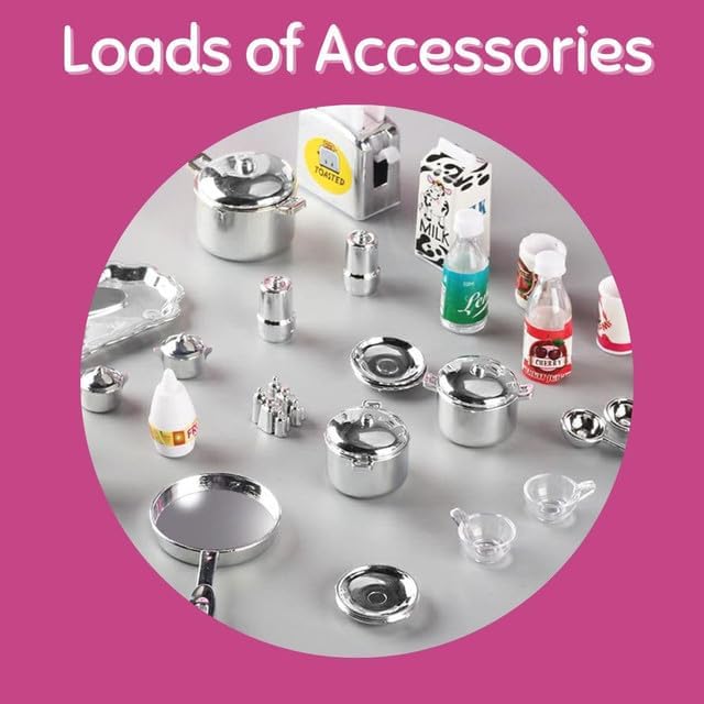 - Doll Kitchen: Unleash kitchen adventures with our Pink Mini Playset! Realistic lights & sounds, open cabinets, and space for doll-sized fun. Let creativity cook up endless giggles!