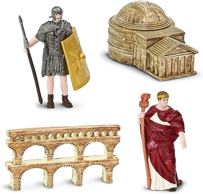 - Diverse Collection: This Super Toob includes figurines representing the key aspects of Ancient Rome: a Gladiator, Noblewoman, Centurion, Senator, General Caesar, Emperor, Legionnaire, a Roman Ship, the Triumphal Arch, Colosseum, Aqueduct, and Pantheon.