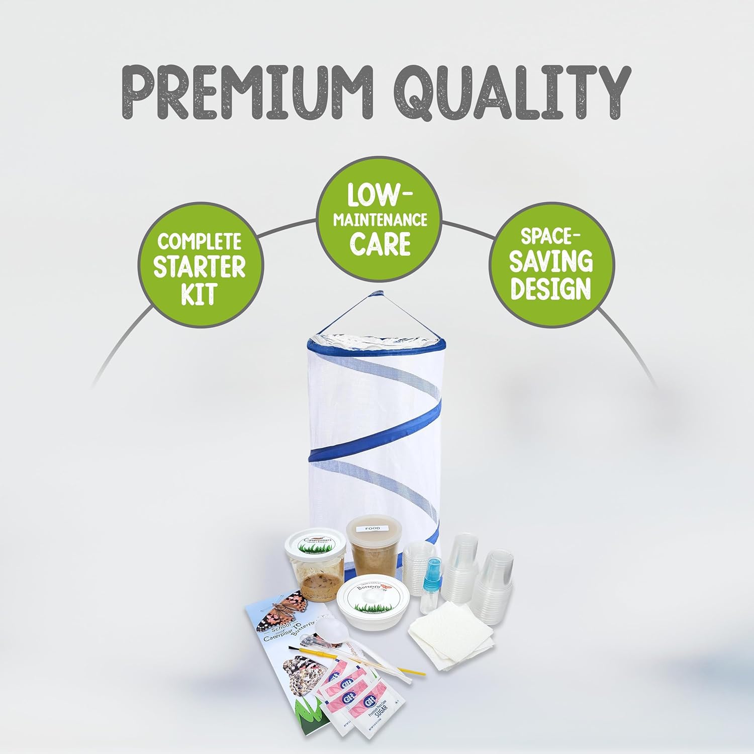 - Easy & User Friendly: The included rearing supplies make this kit simple to use. Your butterfly kit with live caterpillars includes 32 small cups, a transfer brush, food, mister, butterfly feeder, sugar, eye dropper, easy instructions, and a life cycle coloring page.