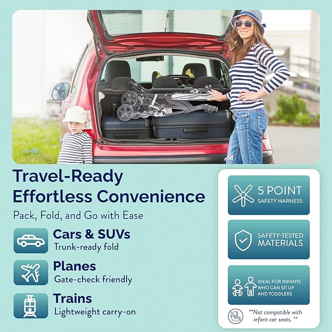 - Self Standing Travel Stroller for Airplane - Toddler travel stroller utilizes one hand steering, all terrain wheels and a smooth front suspension making it the best stroller for travel. Foldable stroller lightweight travel measures 18x12x34” when folded