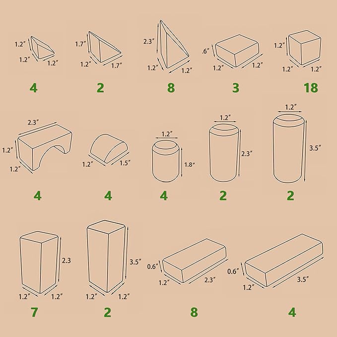 - Beneficial to All Ages: Inspiring classic creativity and improving dexterity, this classic wooden block set and carry case includes 13 different shapes for your children to build to their heart's content. Their imagination will run wild creating unique masterpieces with the variety of shapes. Each suitable size for children to handle including: square, rectangle, circle, half-circle, triangle, cylinder, arch and more! This toy can also serve as a "communication tool" for the young and old!