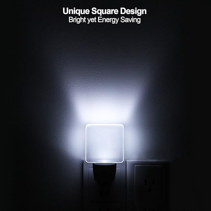 - 【UNIQUE DESIGN】 Clear and square acrylic material flat against the wall, night lights plug into wall gives off a warm white diffused light; the non-polarity plug does not block the second outlet on the wall