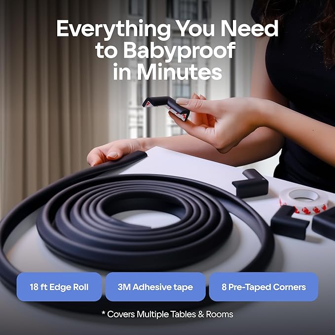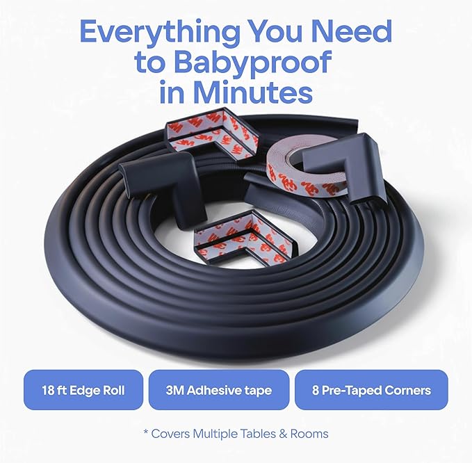 Baby Proof Corners and Edges with Furniture Corner & Edge Safety Bumpers, Impact-Absorbent 18ft Bumper & 8 Foam Corner Protectors, Cushy, Thick, Odorless Table Edge Protectors for Baby, Child | Black