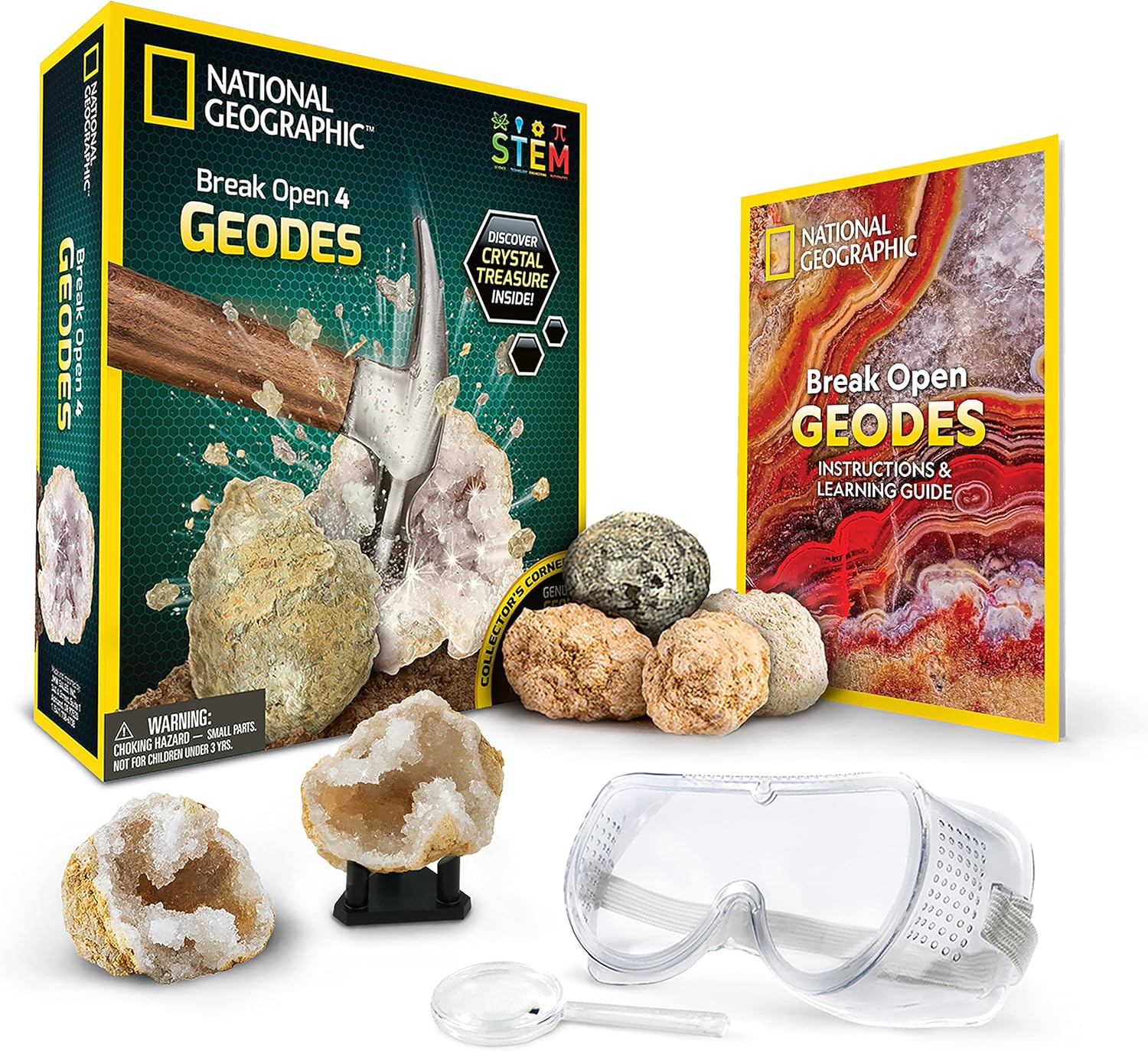 NATIONAL GEOGRAPHIC Break Open 4 Geodes Science Kit – Includes Goggles and Display Stand - STEM Science Gift for Boys and Girls, Break Your Own Geodes with Crystals (Amazon Exclusive)