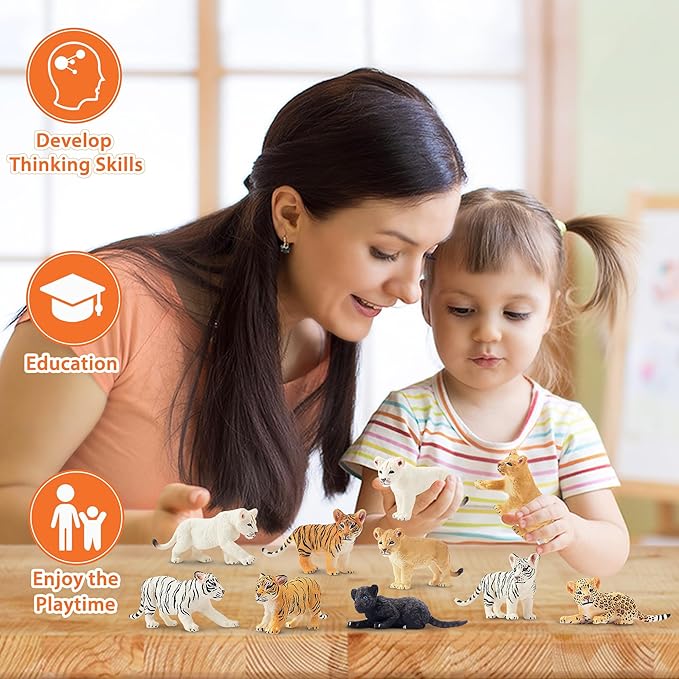 - ✔ SAFARI ANIMALS FIGURINES TOY SET: Includes cubs of 2 Lions, 2 Tigers, 2 Leopards, 2 White Lions, 2 White Tigers & 2 Black Leopards, totally 12 animal figurines. From 1 inch to 3 inch in length, each figure about 0.03pounds in weight. It's a amazing gift and Educational toys for Children 3 year-old and up.