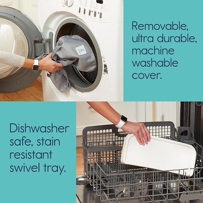 - MACHINE WASHABLE COVER | We all know that babies are messy eaters! Our portable booster seat is designed to effortlessly wipe clean, allowing more quality time with your precious tot. To assist with the inevitable mess, the fabric cover slides off the frame for machine washing - a must have for sanitizing and spaghetti stain removal.
