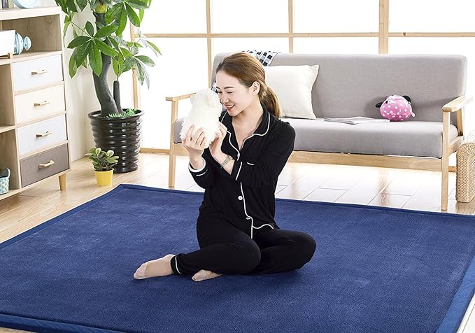 - Upgrade Memory Foam Carpet: Our carpet for living room is made of 100% coral velvet fabric and 1.18 inch (3cm) thick upgraded high-density memory foam filler, which is soft and comfortable to the touch and enhances resilience. The newly upgraded blue rug adds more cushioning at the foot, and the 94 x 78 inches extra large baby play mats has enough space for family activities.