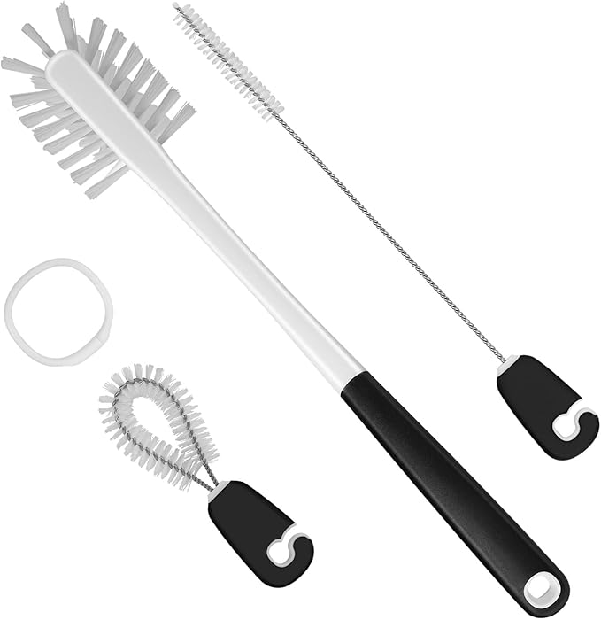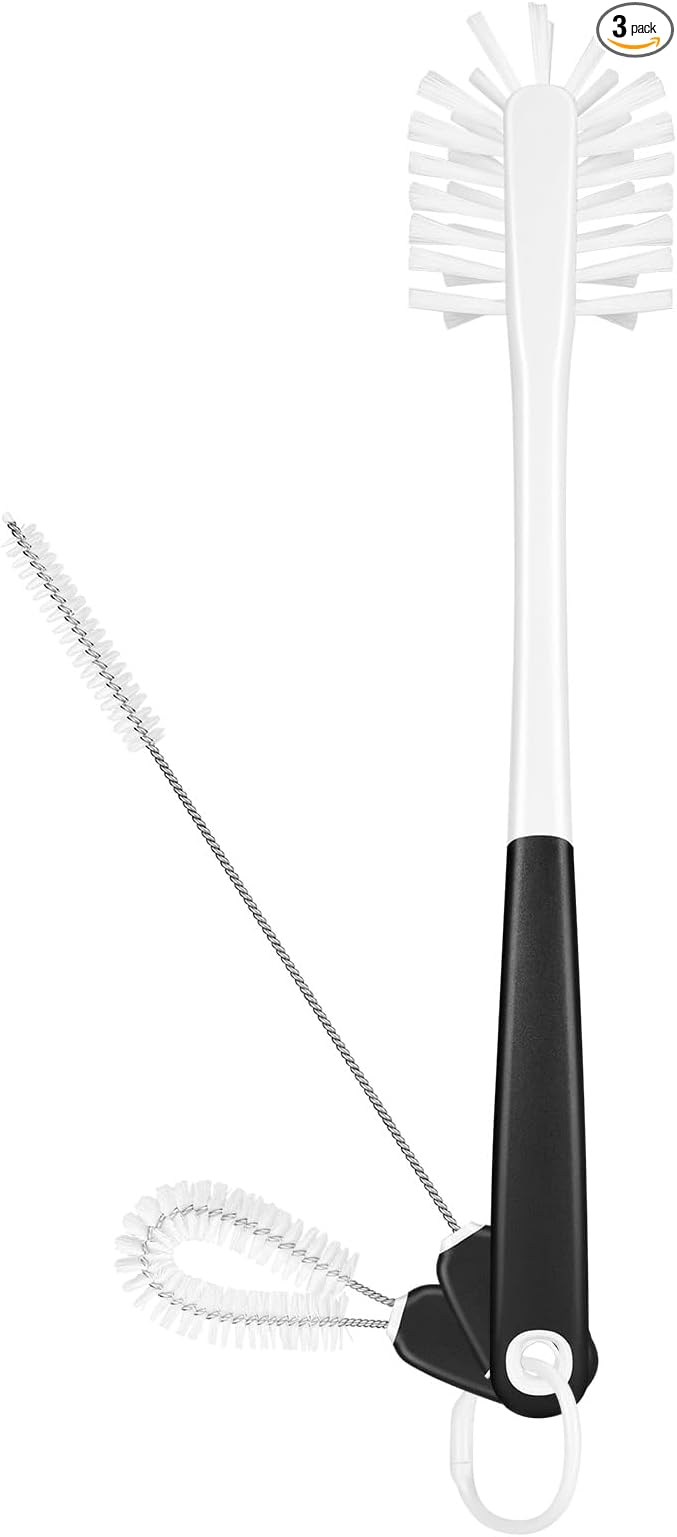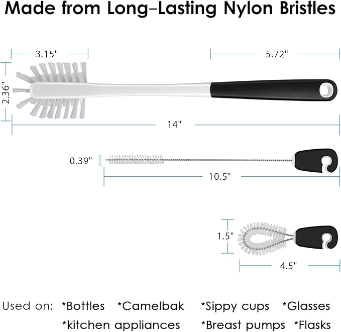 - Convenient Storage: All three brushes have long-lasting nylon bristles that won't lose their shape and soft, comfortable, non-slip handles, store together on a handy ring and easily snap off for use; triple swivel hook is self-sticking and keeps your water bottle brush set handy and your home organized