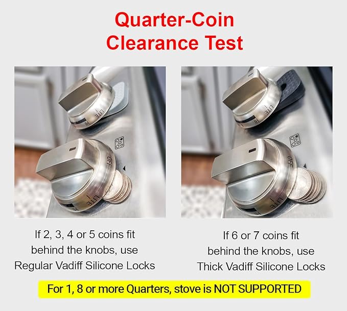 - IMPORTANT: Perform the Quarter-Coin Knob Gap Test to determine the size of Locks to order; When cooking, remember to tuck the Locks behind the knobs if distance between knobs and oven door is short.