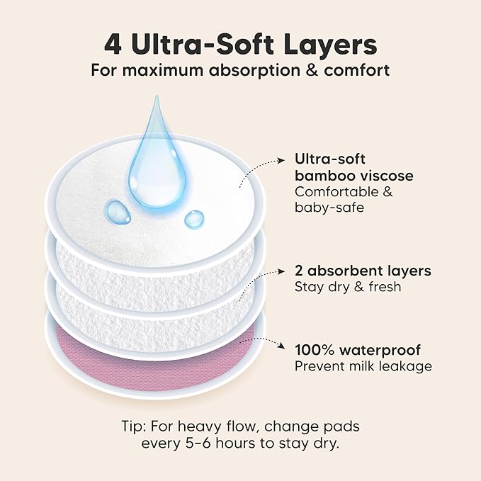 - Great For Leakages – Leakage is a thing of the past with our 4-layer nursing pads. KeaBabies Nursing Pads feature three layers of ultra-absorbent viscose derived from bamboo, sealed with a protective waterproof outer layer for extra security on the nipple pads. Tip: If you experience a heavy flow, please replace breast pads every 5-6 hours.