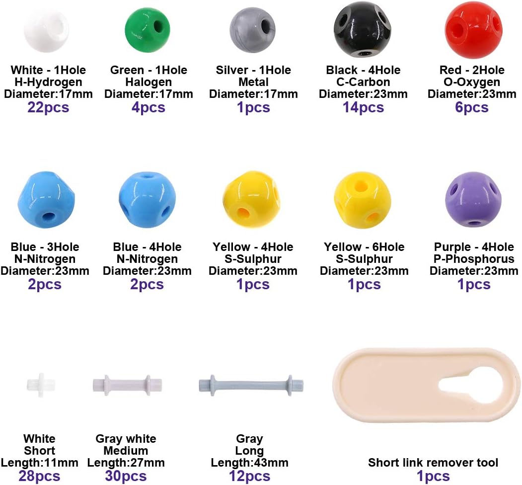- ★ MOLECULE SCIENCE IN 3D --- We have prepared 125 Pcs molecular model set for you, This model contains C, H, O, N, P, S, Halogen, and other metals and a variety of single and double bonds, long bonds, long keys. Can be put high school, university chemistry in most of the organic or inorganic molecular structure model for the study of experimental operation.