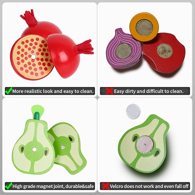 - Magnetic Joint. With high grade magnet holding the toy fruits pieces together, then “slice“ apart, perfect for pretend play again and again.