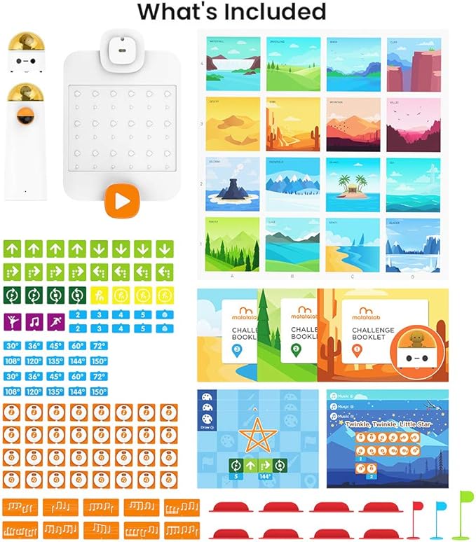 - What you get: 1 MatataBot, 1 command tower with picture recognition camera, 1 control board, 99 pieces of coding blocks, 3 family challenge books, 3 artist warm-up cards, 3 musician warm-up cards, 1 double-sided playing card, 1 USB-C cable, obstacles and flags, resources are constantly updated. Our worry-free 12-month warranty and friendly customer service. The control tower and robot are rechargeable