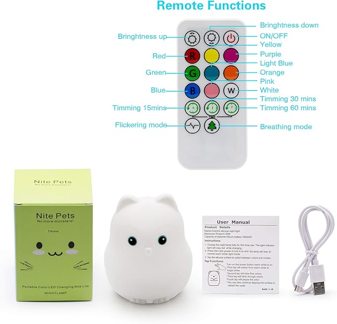 - 2. Clap+Remote Control: This baby light is sensitive clap control, So you can change colors by tap its surface. Just a slight clap, the lamp will light up. It also is equipped with a remote control, which can be operated remotely within a distance of 4 to 7 meters. Its function has setting working mode, colors switching, adjusting the brightness of light, and setting working time (15, 30, 60 minutes). So with a remote, you could control the cute night light easier and more conveniently.