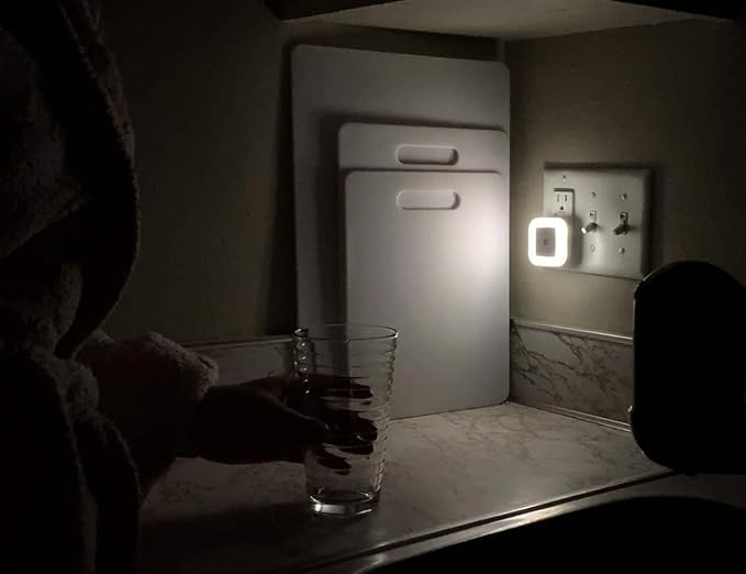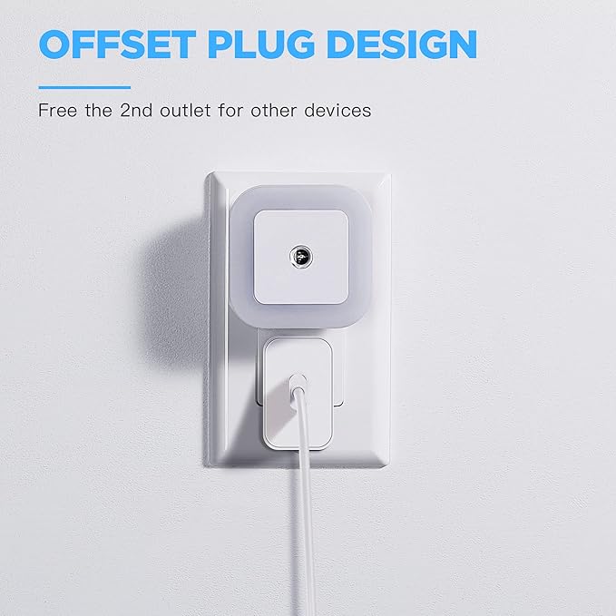 - Extremmely Compact and Safe: Offset plugs and compact size(2.5 x 2.5 inches), the nightlight does not block the second outlet, so you don't have to unplug the nightlight always. And the night lights are with superior V-0 fire-resistant casing and over-current protection design to guarantee safety