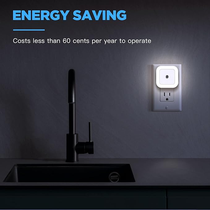 - Energy-saving and Money-saving: Our night-lights are energy-efficient thus it will help you cost less than $0.60 per year to operate (based on 11 cents/kWh). It also helps you do a favor on climate change. And, it has a LED lifespan of 10,000+ hours. No need to replace bulbs