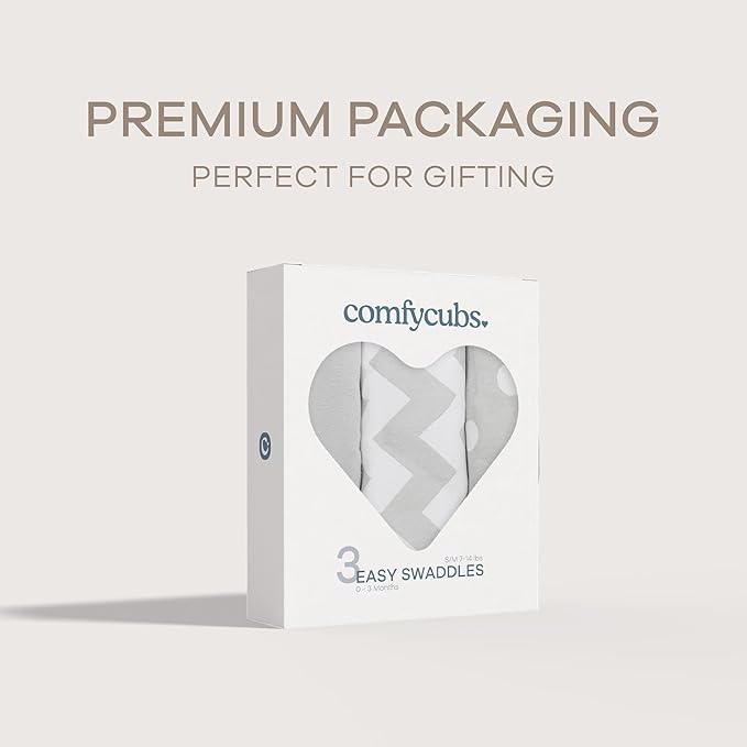 Comfy Cubs Easy Swaddle Blanket, 3 Pack - 100% Cotton Newborn Wrap, Small for 0-3 Months Infants, with Adjustable Velcro, Breathable and Durable Sleep Sack for Babies - Grey