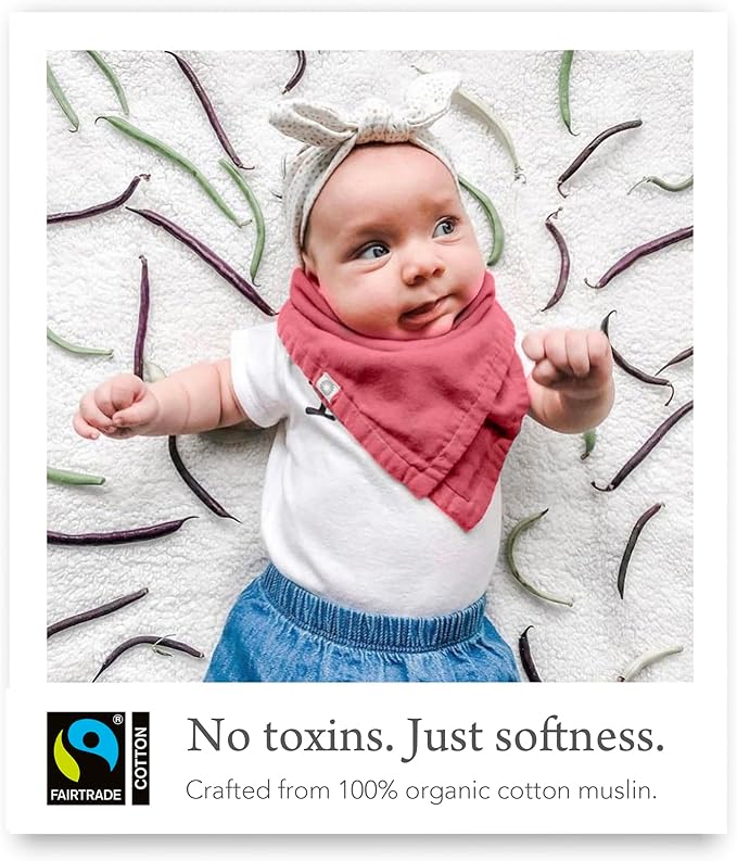 • 100% ORGANIC COTTON MUSLIN, FAIRTRADE CERTIFIED – Every bib is made from Fairtrade-certified organic cotton muslin, supporting better wages, safer working conditions, and dignity for the people who make them. No toxins. No harsh dyes. Just softness with real substance.