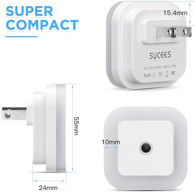 - Extremmely Compact and Safe: Offset plugs and compact size(2.5 x 2.5 inches), the nightlight does not block the second outlet, so you don't have to unplug the nightlight always. And the night lights are with superior V-0 fire-resistant casing and over-current protection design to guarantee safety