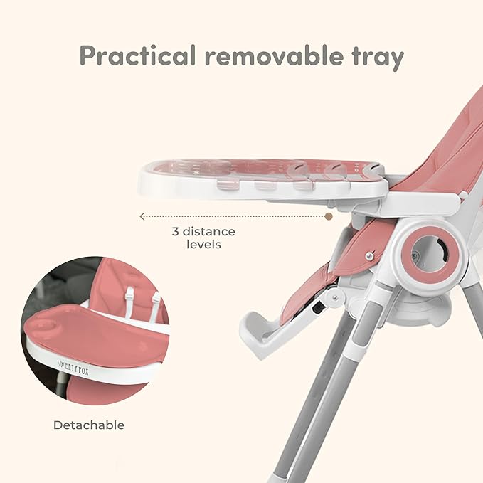 - PREMIUM BABY HIGH CHAIR: ADJUSTABLE AND FOLDABLE - The Sweety Fox portable high chair, which grows with the baby into their toddler years, is very easy to adjust. It offers 5 positions for the reclining seat back, 3 positions for the footrest and 7 different seat heights. Your baby can eat in total comfort in our baby chair. The baby high chair is a convertible high chair designed to be used in many different ways.