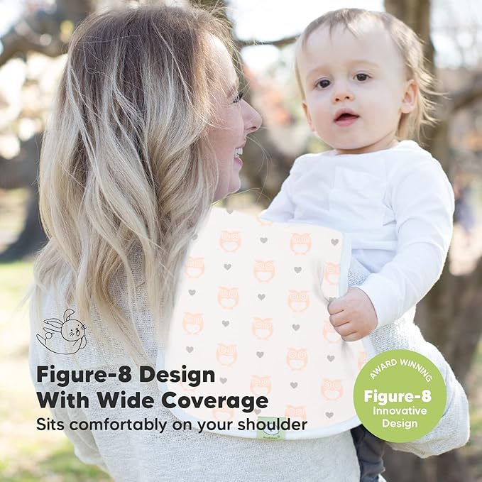 - The Figure-8 Full Shoulder Coverage - Our organic baby burp clothes for baby girls and baby boys, sized at 21" x 10", are wide enough to cover your shoulders. The unique figure-8 design prevents the burp rags from slipping.