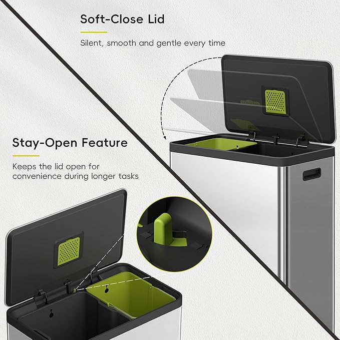 - Dual Compartment Trash Can - Easily distinguish between waste and recyclables with 2 removable, color-coded inner buckets.