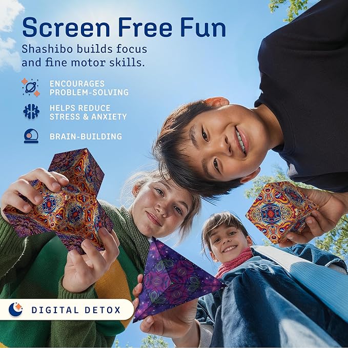- Nothing compares to the quality & unique design of Shashibo! For kids Shashibo provides creative, screen free exploration that keep their attention and is the ultimate travel toy because it is compact and quiet. For kidults it is calming to the mind and body, a perfect digital detox!