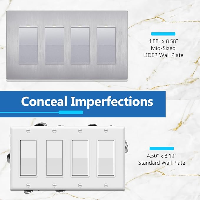 LIDER Brushed Finish Decorator Switch Cover, Screwless Wall Plate, Mid-Size 4-Gang 4.88" x 8.58", Unbreakable Polycarbonate Thermoplastic, UL Listed, LSWP-34M-BSV, Brushed Silver