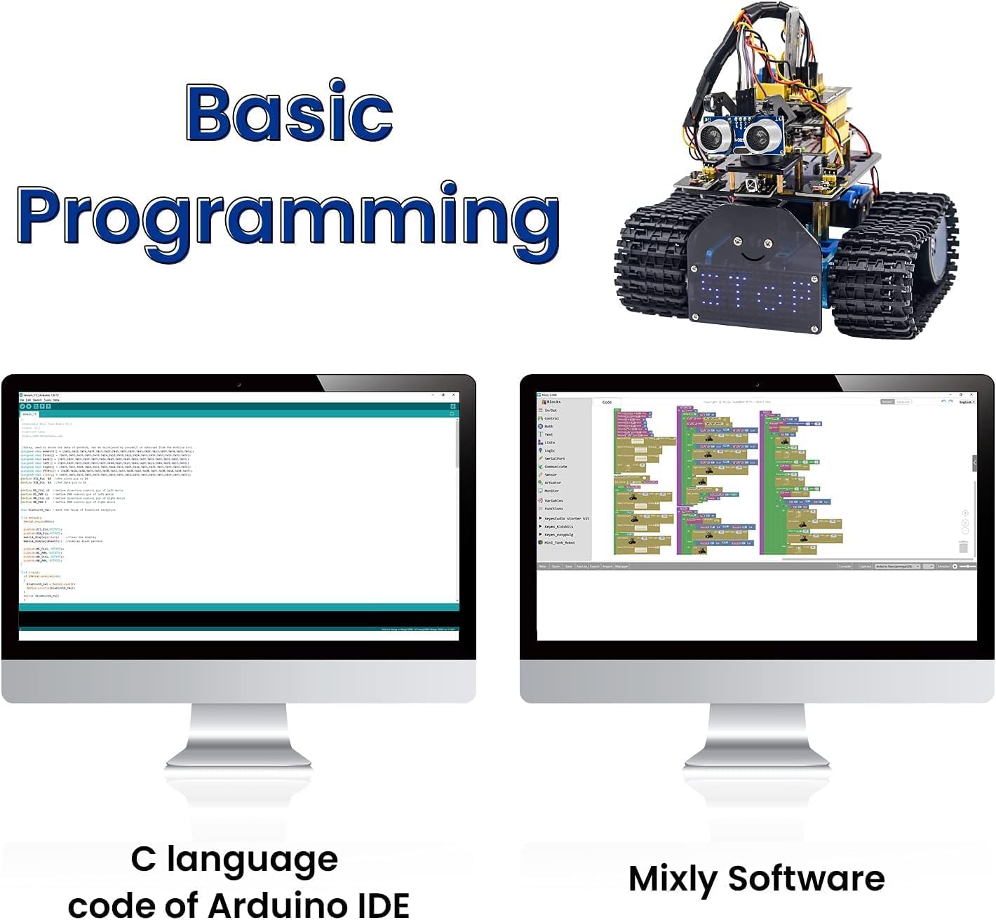 - 2 in 1 Car Kit and Electronics Kit:This tank robot car kit is compatible with Arduino and Mixly ((block programming platform) , ideal for Arduino beginners and professionals to learn robotics, electronics and programming.Teenagers or adults can learn coding from Scratch to Arduino after assembly and get a lot of fun of making.