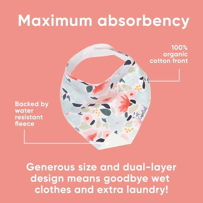 - MAXIMUM ABSORPTION: Fronted by ultra-soft Organic Cotton and lined with water-resistant polyester fleece to provide an extra layer of absorbency. Each bib is crafted with dual-layer protection against heavy drooling or spit-up, keeping your baby dry and comfortable.