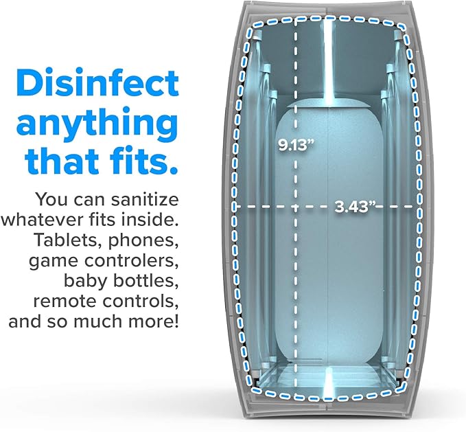 - CLEAN WHATEVER FITS: The HomeSoap can fit large tablets, remots, toys, baby bottles, headphones, and more! The large capacity sanitizing bay can disinfect anything in the 13.18" x 3.66 " x 9.24" internal area.
