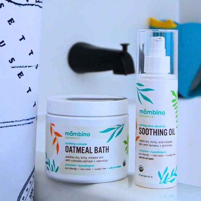 Mambino Organics Calming Skin Set, Oatmeal Bath Soak Powder & Soothing Body Oil, Fragrance-Free with Jojoba & Evening Primrose, Gentle for Babies & Adults, Ultra-Sensitive Skin, Vegan, 11 oz