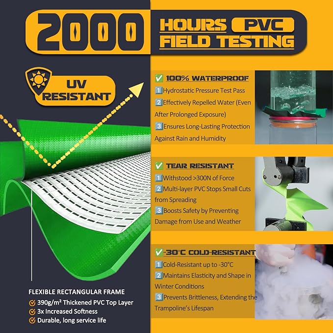- 👨👩👧👧【270° All-Around Safety Protection】👨👩👧👧At ULTRAPOWER SPORTS, your child's safety comes first! Our trampoline pad replacement is designed to shield kids from exposed springs, preventing injuries while they jump. The extended 270° protective cover wraps around the trampoline frame, offering inside-out protection. Built for durability, it features a 0.55mm thick PVC surface + 0.6-inch protective cotton + an ultra-dense PE bottom, ensuring maximum safety, comfort and fun.