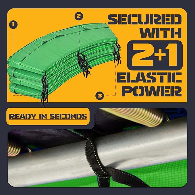 - 👨👩👧👧【270° All-Around Safety Protection】👨👩👧👧At ULTRAPOWER SPORTS, your child's safety comes first! Our trampoline pad replacement is designed to shield kids from exposed springs, preventing injuries while they jump. The extended 270° protective cover wraps around the trampoline frame, offering inside-out protection. Built for durability, it features a 0.55mm thick PVC surface + 0.6-inch protective cotton + an ultra-dense PE bottom, ensuring maximum safety, comfort and fun.