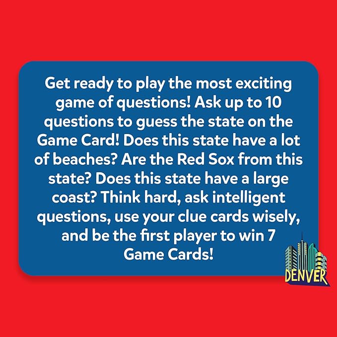 - ULTIMATE GUESSING GAME: Divide yourselves up in teams, or play one on one, and ask up to 10 questions to guess the state on the Game Card! Does this state have a lot of beaches? Are the Red Sox from this state? Does this state have a large coast? Think hard, ask intelligent questions and be the first player to win 7 game cards!