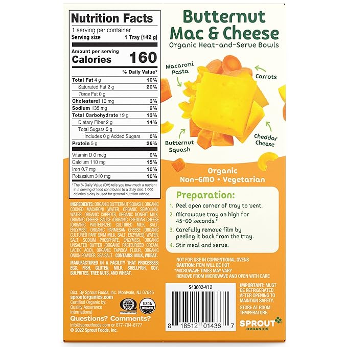 Sprout Organic Baby Food, Toddler Meals, Macaroni Pasta with Butternut Squash Cheese Sauce, 5 Oz Bowl (8 Count)