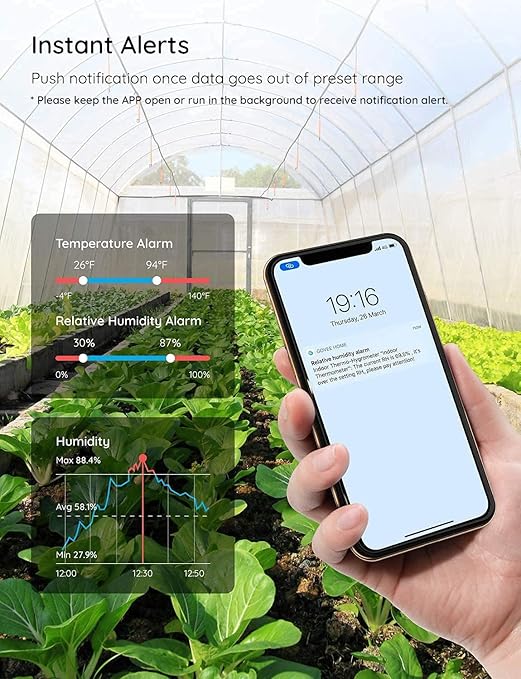 - Smart App Alert: You'll receive a notification alert once temperature or humidity is out of preset range. It can help you effectively adjust the situation of your wine cellar, greenhouse, basement or other places in time.