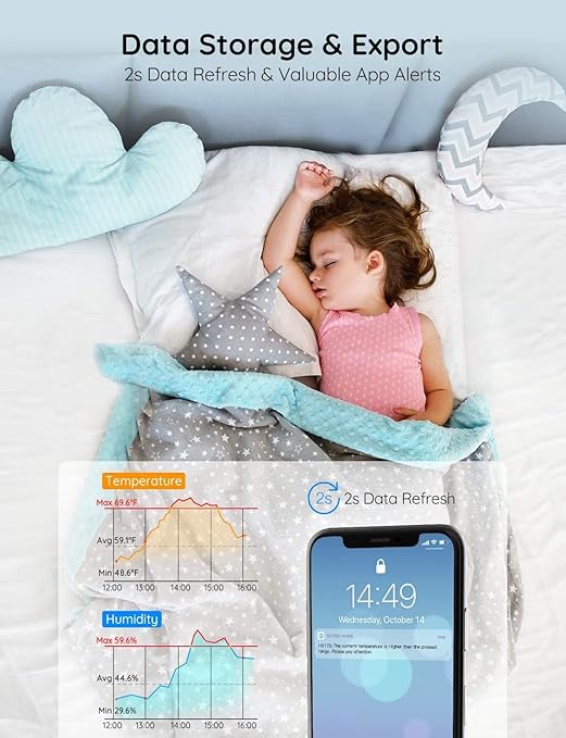 - Data Storage & Export: Our WiFi temperature sensor uploads data to the App when connected via Bluetooth or WiFi. Enjoy 20 days of online data storage view and export up to 2 years' worth of data seen through clear historical trends and graphs.