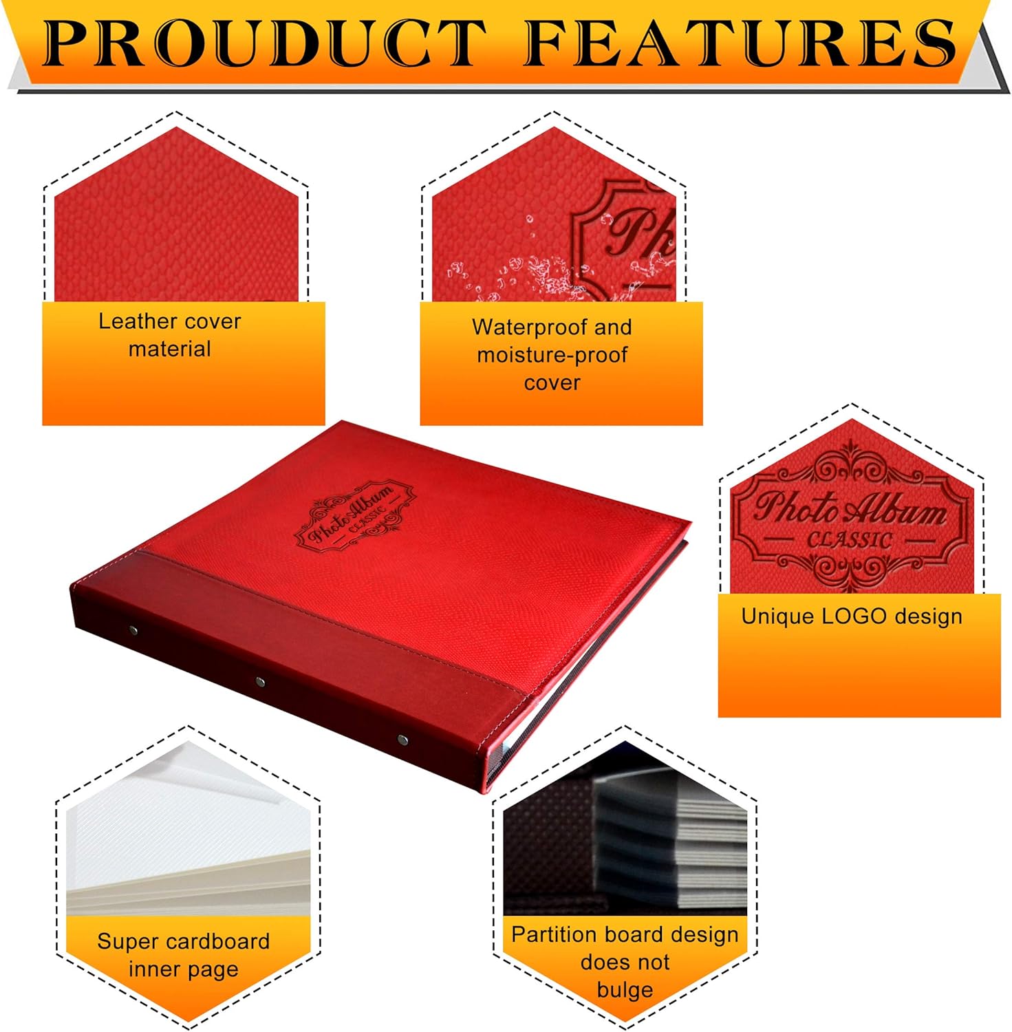 Photo Album Holds 3X5, 4X6, 5X7, 6X8, 8X10 Photos, Leather Cover, Magnetic Self-Stick Page, Hand Made DIY Albums (Red, Large)