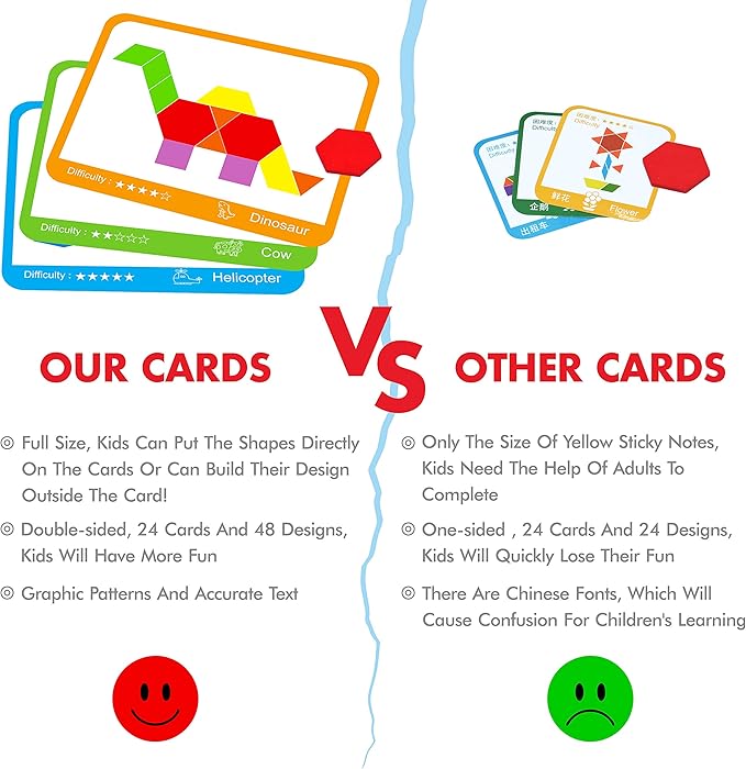 - Fun to Play:24 double sided full size graphic cards,This means kids can put the shapes directly on the cards or can build their design outside the card! Kids could turn their imagination into touchable shapes, recognize colors and guide them to understand the segmentation and synthesis of graphics, and thus enhance children's hand sensory, patience and observation ability.