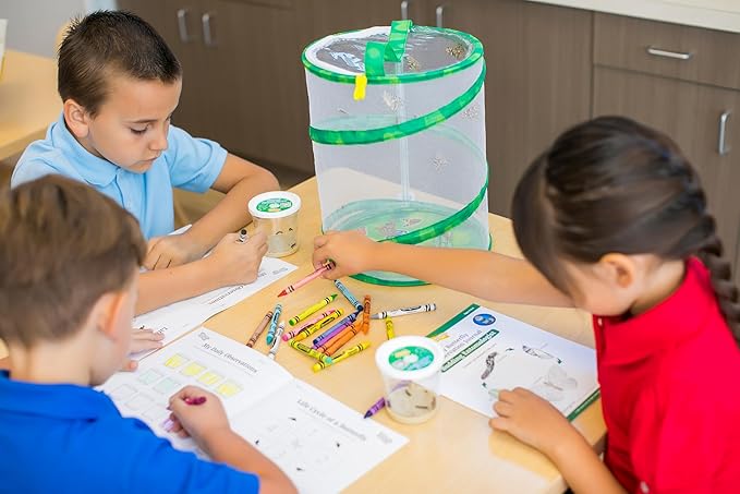 - Included: 2 cups of caterpillars along with their food, a reusable 12-inch-tall mesh habitat, 2 Chrys-A-Lid holders, a Flower-shaped Feeder, sugar packets for nectar, STEM Activity Journal, Instruction Guide, and dropper.