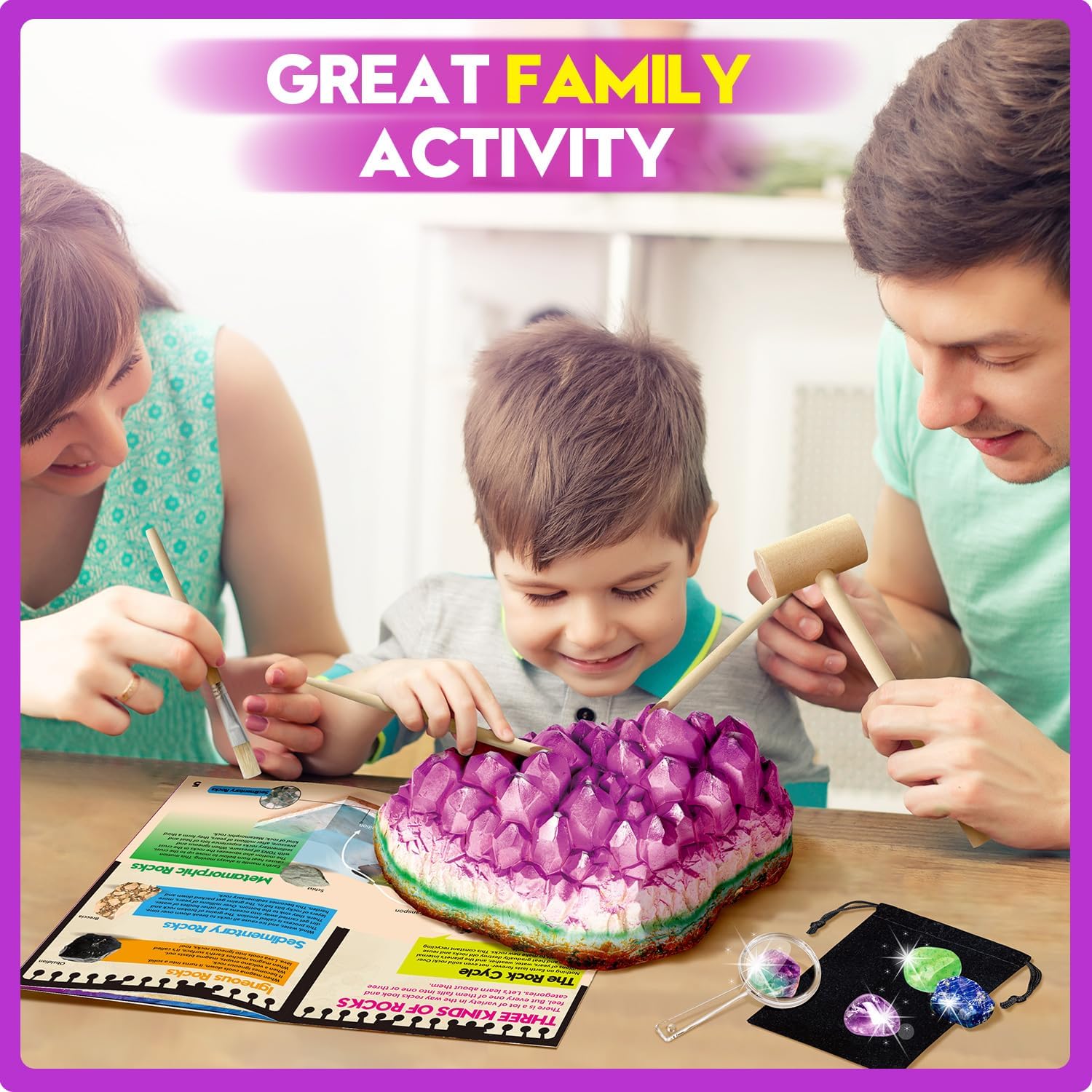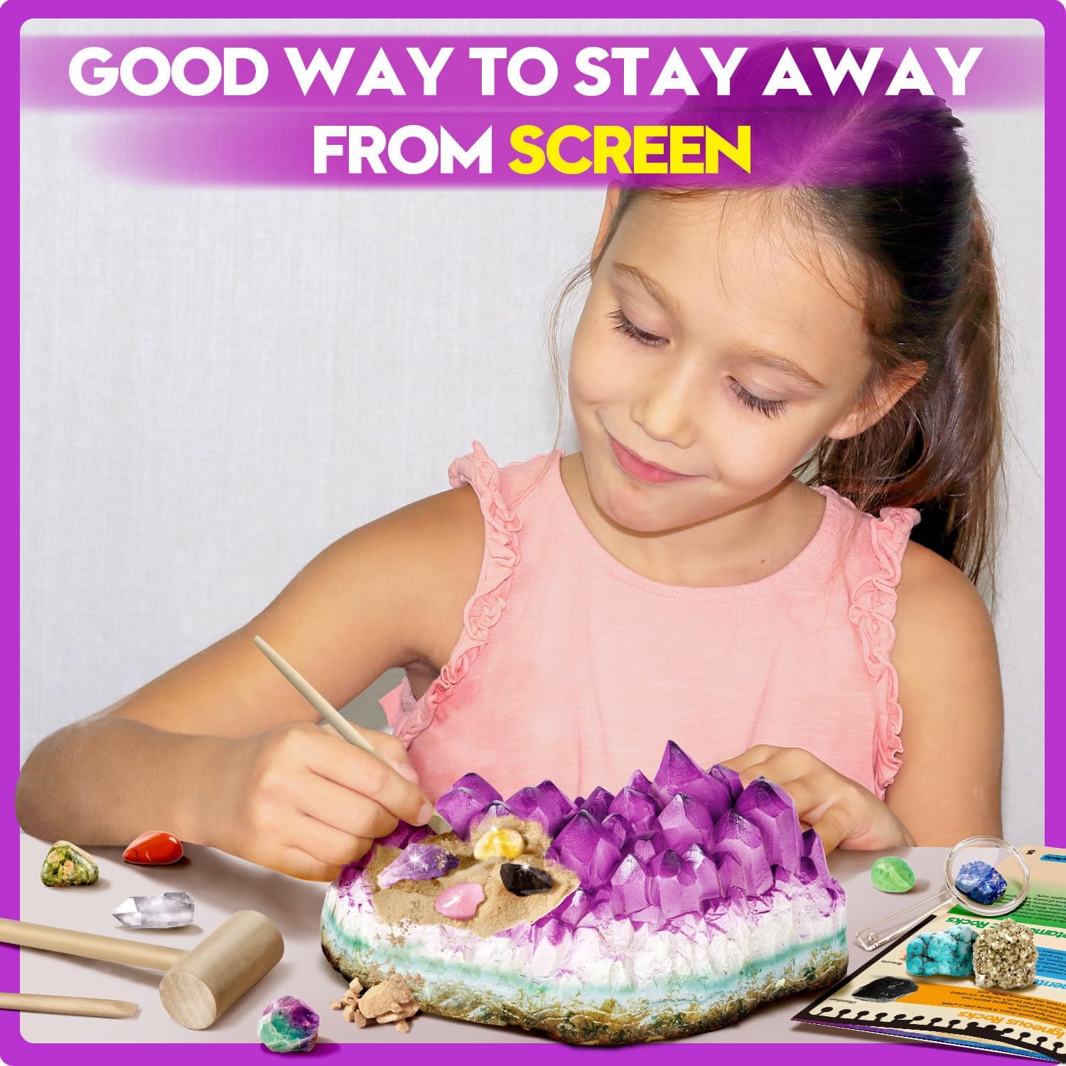 - [JUMBO GEMS DIG KIT] Discover the Excitement of Gemstones! Unearth a massive Amethyst block to reveal 18 radiant gem treasures. Delve into a vibrant learning experience with a vivid, full-color guide that unveils the secrets of gem formation and extraction, aiding young explorers in identifying their newfound specimens. This kit is an educational science kits for kids. Spark curiosity and empower kids with hands-on gem education!