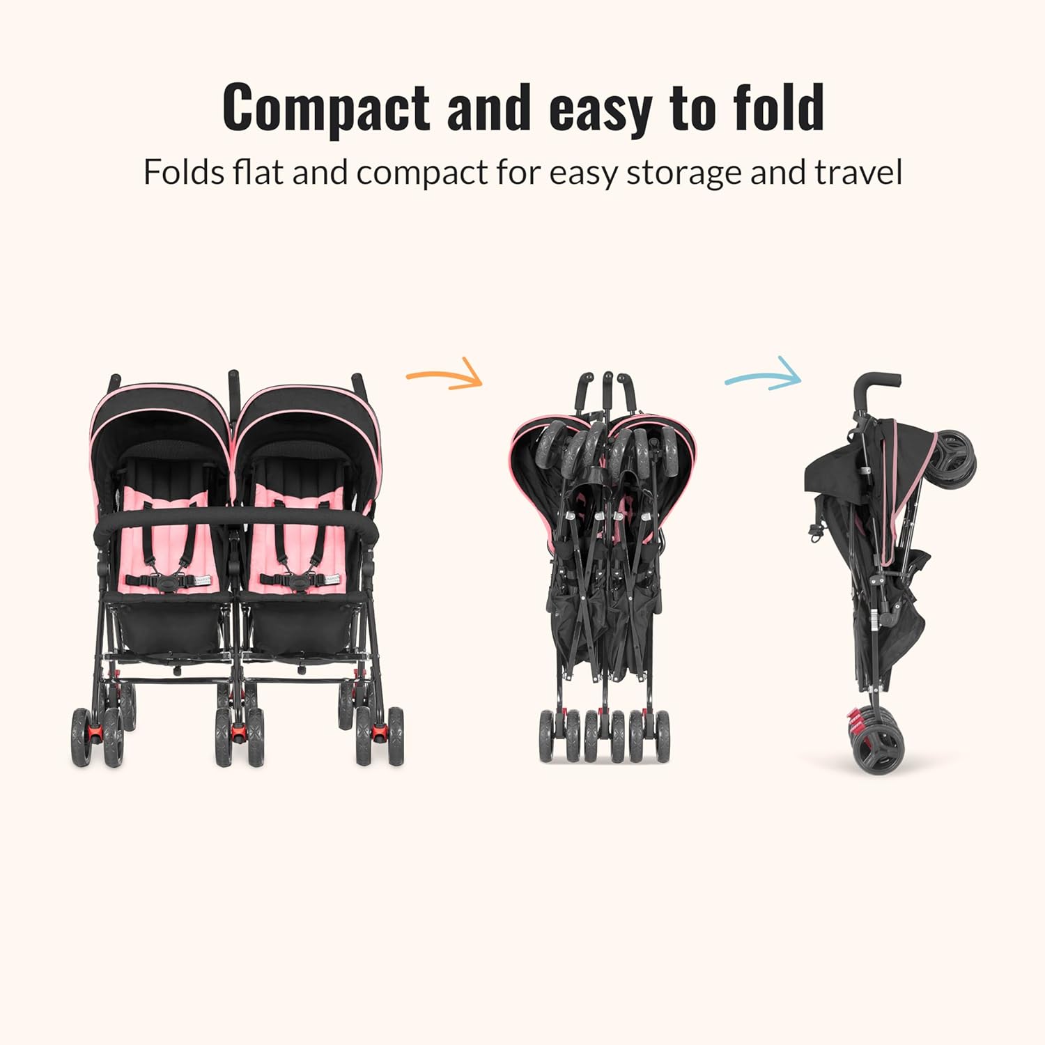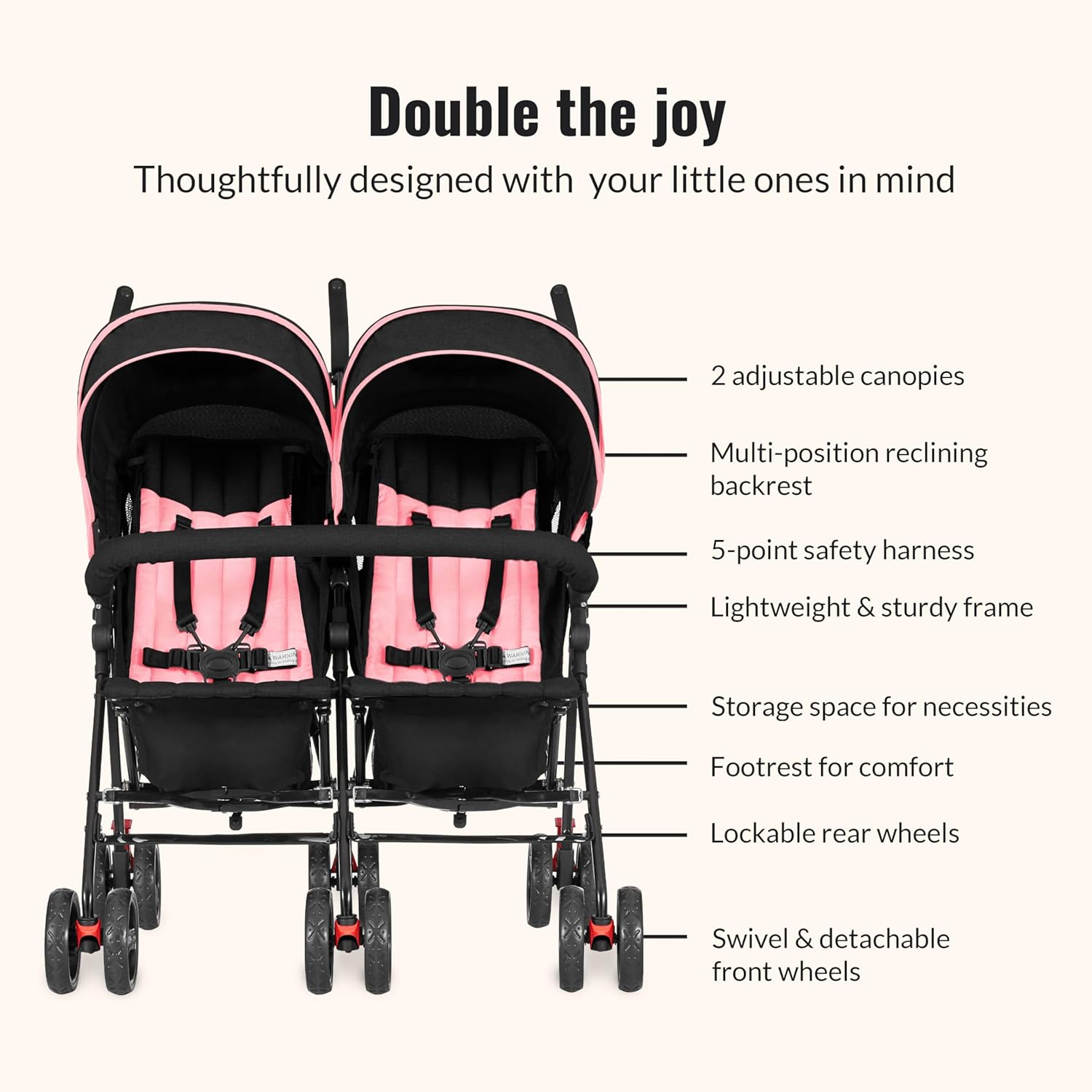 Dream On Me Volgo Twin Umbrella Stroller in Pink, Lightweight Double Stroller for Infant & Toddler, Compact Easy Fold, Large Storage Basket, Large and Adjustable Canopy