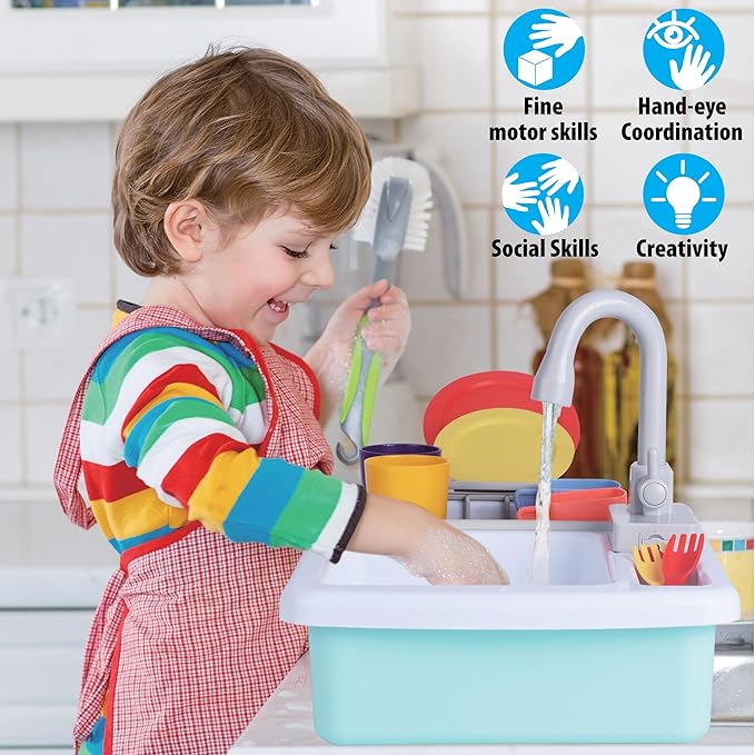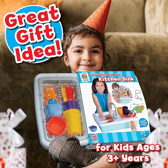 Small World Toys Play Sink with Running Water, Kids Play Kitchen Sink Toys for Kids Age 3+, Automatic Faucets with Realistic Dishes, Toddler Sink Pretend Play Set Gifts for Girls and Boys