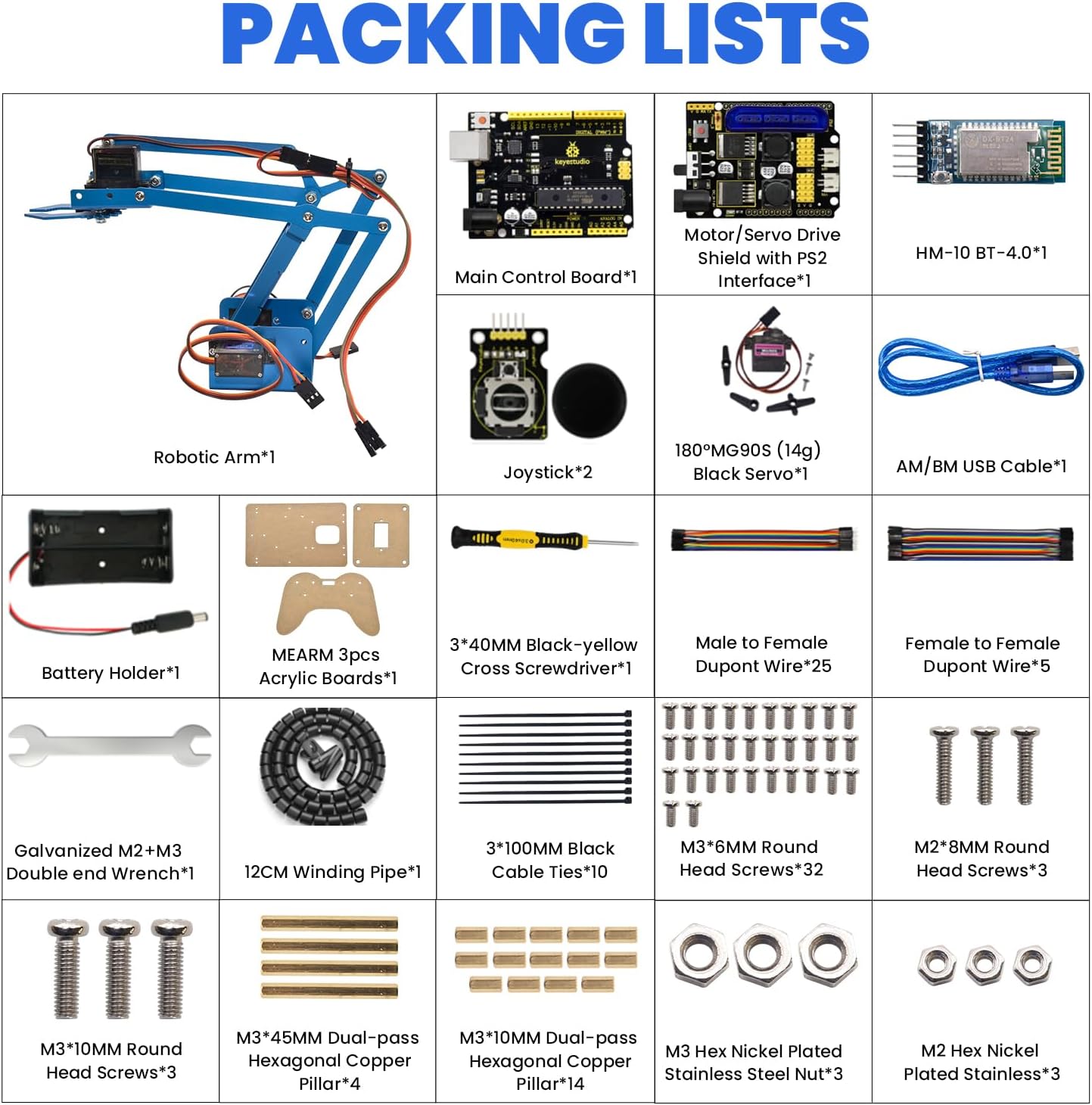 - KEYESTUDIO Robot -This product is suitable for users over 15 years old with a theoretical basis for electronic programming.By assembling this robotic arm, it can help beginners have a deeper understanding of programming and electronics.