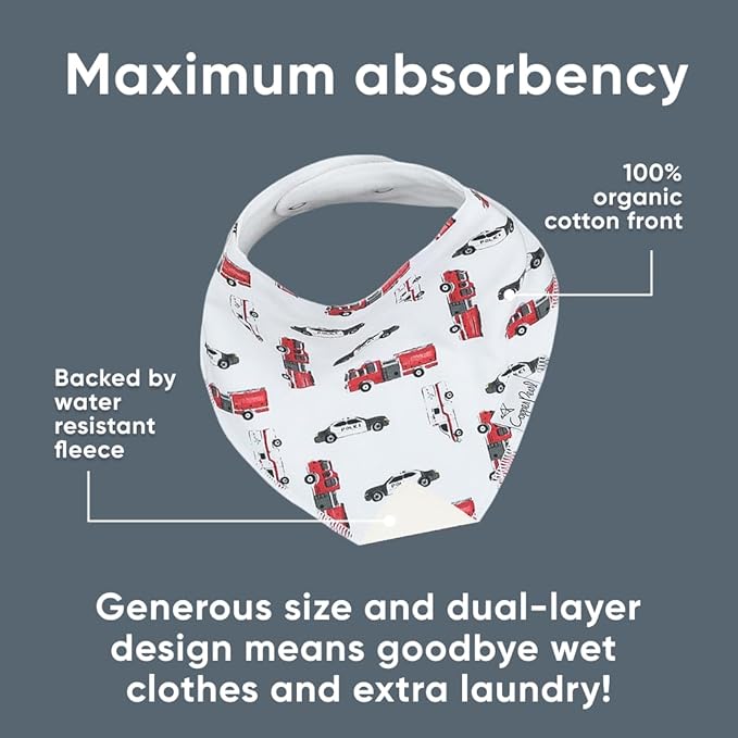 - MAXIMUM ABSORPTION: Fronted by ultra-soft Organic Cotton and lined with water-resistant polyester fleece to provide an extra layer of absorbency. Each bib is crafted with dual-layer protection against heavy drooling or spit-up, keeping your baby dry and comfortable.