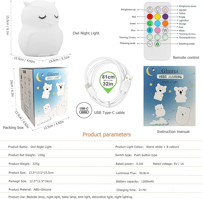 - ☀【Large size safety light】: The size of this owl night light is about 4.92*5.11*6.69 inches, which is larger than the general animal shape night light. The Glinrui squeezable night light has a comfortable and soft touch. It has no sharp edges, no glare, no heat, it can be safely placed on the bed and table, it is perfect for night lighting for babies and toddlers, boys, girls, students, women, the elderly.